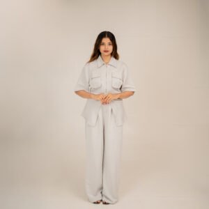The button-down shirt features intricate cutwork detailing on the yoke, adding a touch of sophistication to its minimalist design. Paired with relaxed straight-fit pants, this co-ord set strikes the perfect balance between comfort and class.